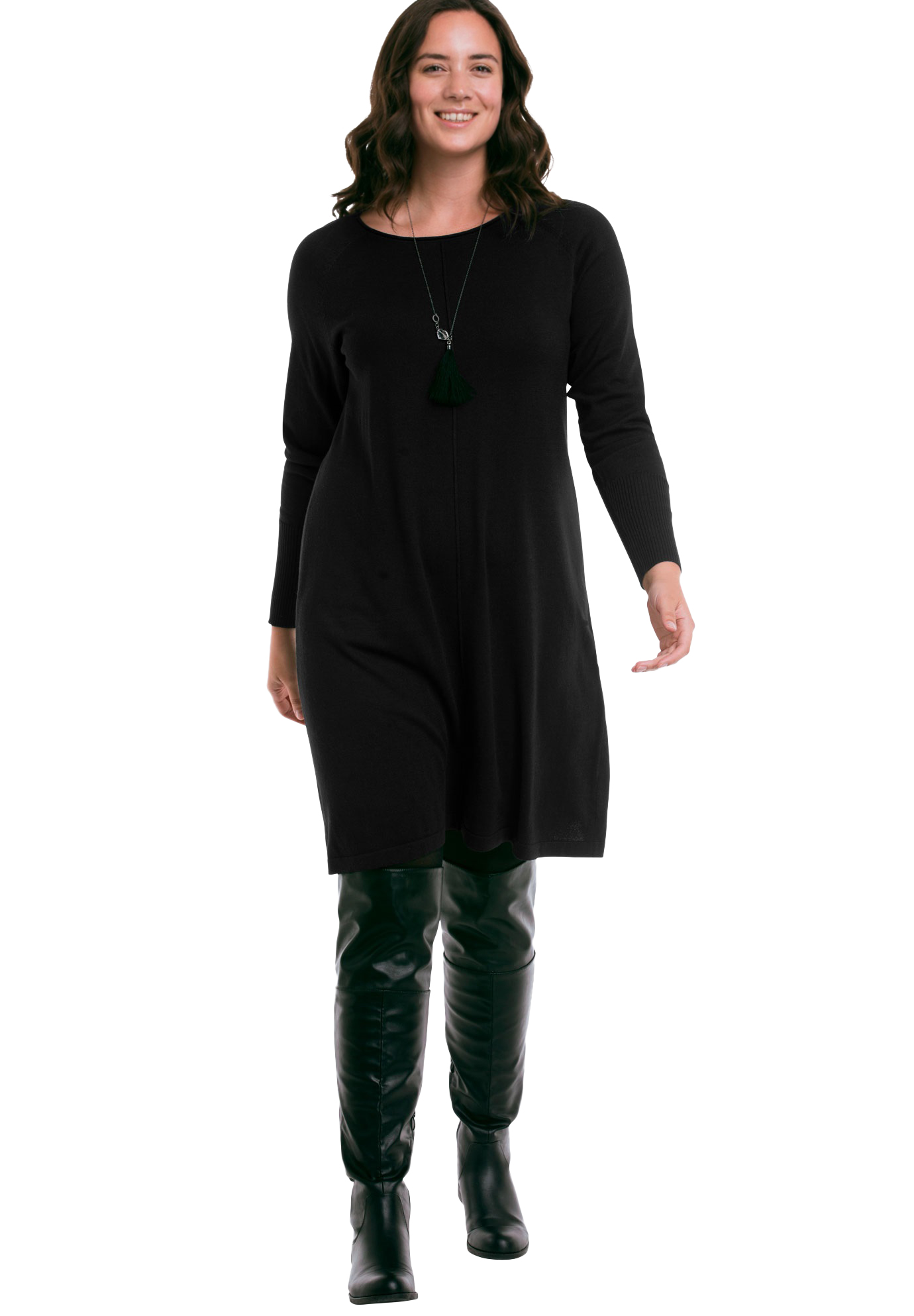 ellos Women's Fine Gauge Sweaterdrss. Our lightweight sweater dress is ideal for both on-duty and off-duty dressing. Cut in a relaxed, straight silhouette, the rolled hem scoop neckline, long raglan sleeves with ribbed cuffs allows for you to dress it up with an ankle boot or down with sneakers. Relaxed silhouette40" from high point of shoulder, hits just above kneePolyester/acrylic/nylon/wool Machine wash cold, imported. Sale Price: 44.90 USD. SKU: 1350425051828mk10121012. Brand: ellos. Color: Black. Gender: female.