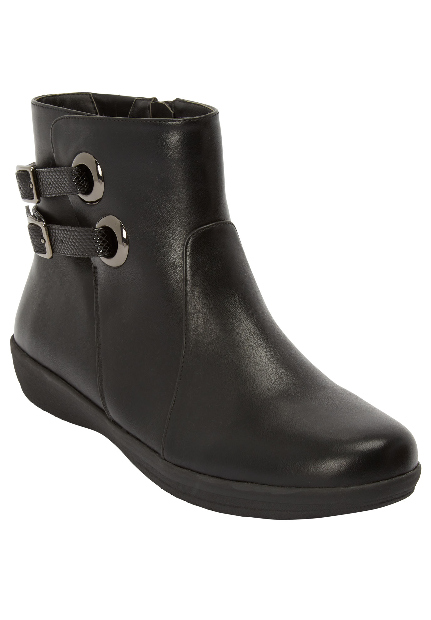 Women's The Eliana Bootie by Comfortview. This endlessly versatile leather-like bootie is perfect for now and later – plus, with its ultra-comfortable padded insole, this simple yet stylish silhouette keeps you looking and feeling your very best all day (and night) long. Leather-like upperFull inside zipperInside elastic gorePadded insoleFlexible, skid-resistant outsole4¾" shaft height 1" heel Comfortable faux leather booties available in full and half sizes 7-11, 12 M, W, WW Sale Price: 104.99 USD. SKU: 2344405350228mk9-WW912WW. Brand: Comfortview. Color: Black. Gender: female.