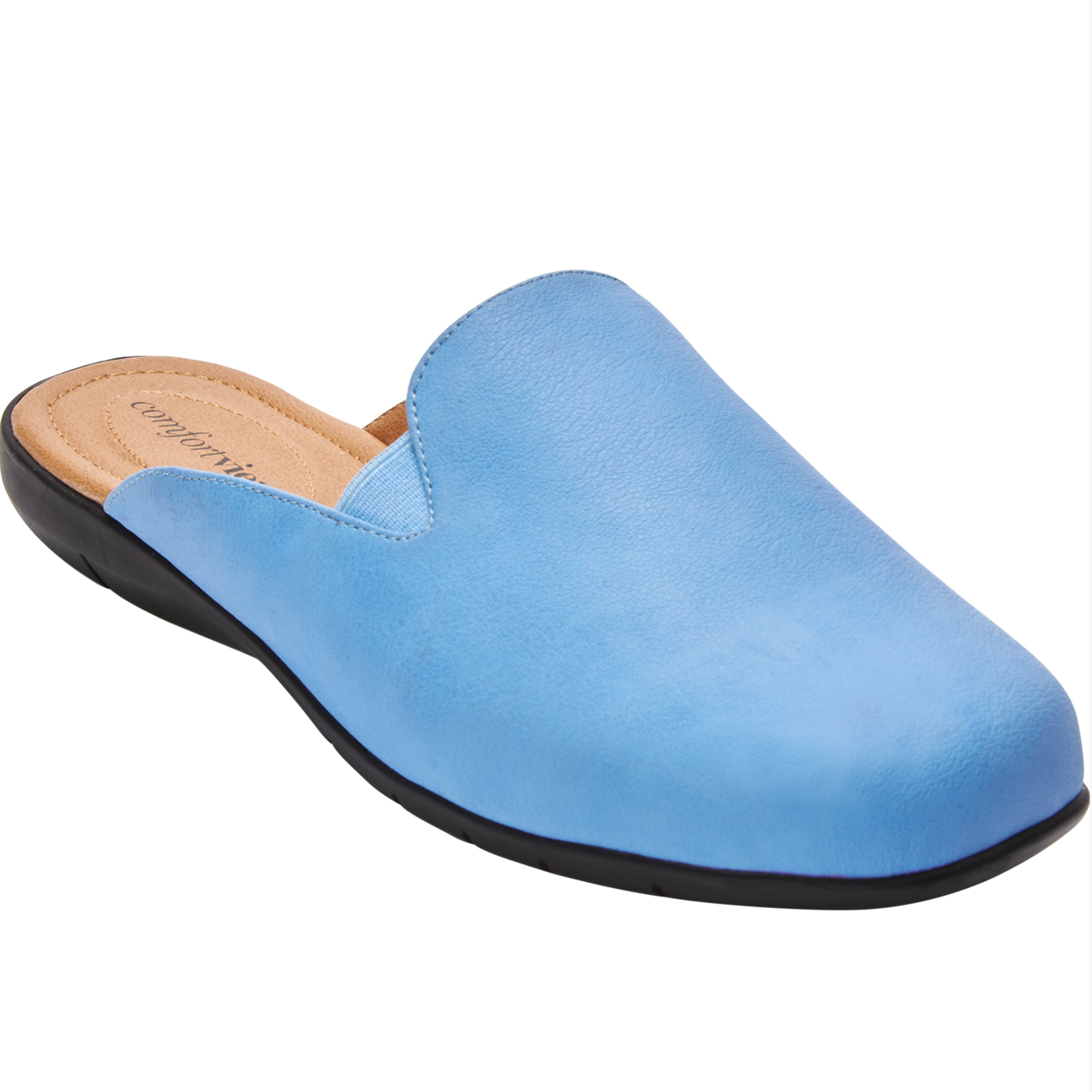 Women's The Emery Mule by Comfortview. A must-have addition to your warm-weather wardrobe with elastic gore for a custom fit. Leather-like upperElastic gore for a custom fitPadded insoleFlexible, skid-resistant outsoleGrooved bottom for extra grip and flexibility1" stable heel Leather-like mules available in full and half sizes 7-11, 12 M; 7-11, 12 W; 7-11, 12 WW Sale Price: 59.99 USD. SKU: 0622505360977mk7-WW712WW. Brand: Comfortview. Color: Denim. Gender: female.
