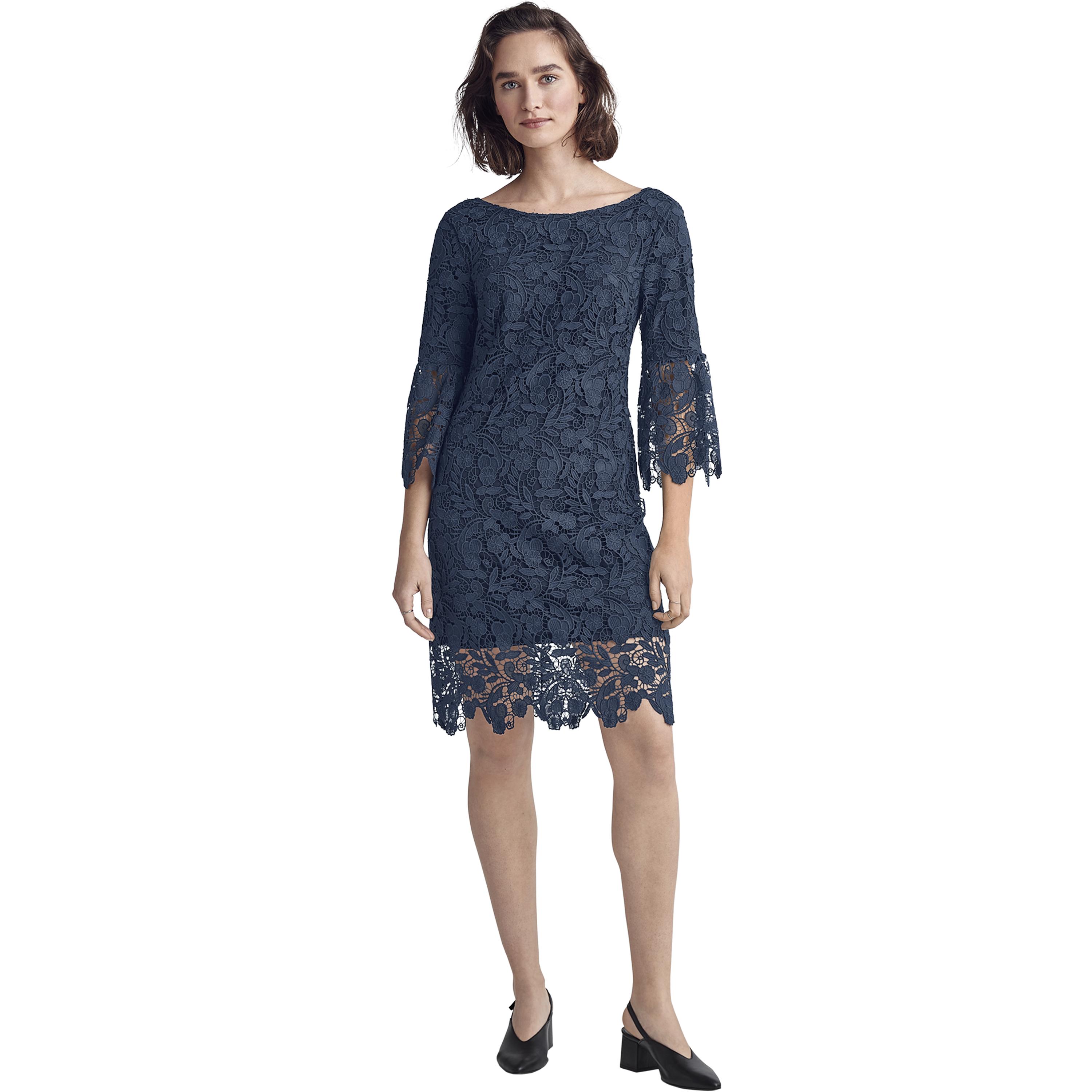 ellos Women's Bell Sleeve Lace Dress. Get RSVP ready this summer in our gorgeous deep back-V lace dress. Delicately trimmed scallop hem at bell sleeves & hem, up the femme factor on this one-piece wonder. A-line silhouetteBallet neckline3/4 bell sleevesInvisible zipper at side seamBody fully linedApprox. 40" hits just above kneePolyesterMachine wash cold. Imported. Sale Price: 69.90 USD. SKU: 2171725030571mk1616. Brand: ellos. Color: Navy. Gender: female.