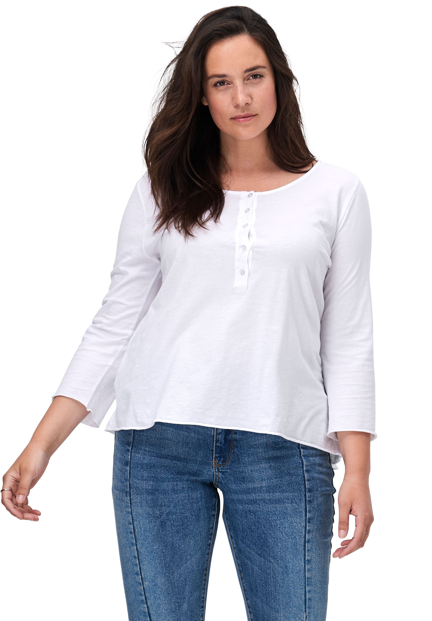 ellos Women's Flounce Back Henley Knit Top Sweater. Elevate your everyday look with this feminine, organza flounce back henley tee. This effortless staple with an unfinished rolled hem & shirring at the flounce, is a great piece to top off your distressed boyfriend denim look. Features ¾ sleeves & high-low hem. A-line silhouetteApprox. 28" hits at low hipCotton Jersey Slub Machine wash cold. Imported. Sale Price: 26.90 USD. SKU: 1543625074396mk18201820. Brand: ellos. Color: White. Gender: female.