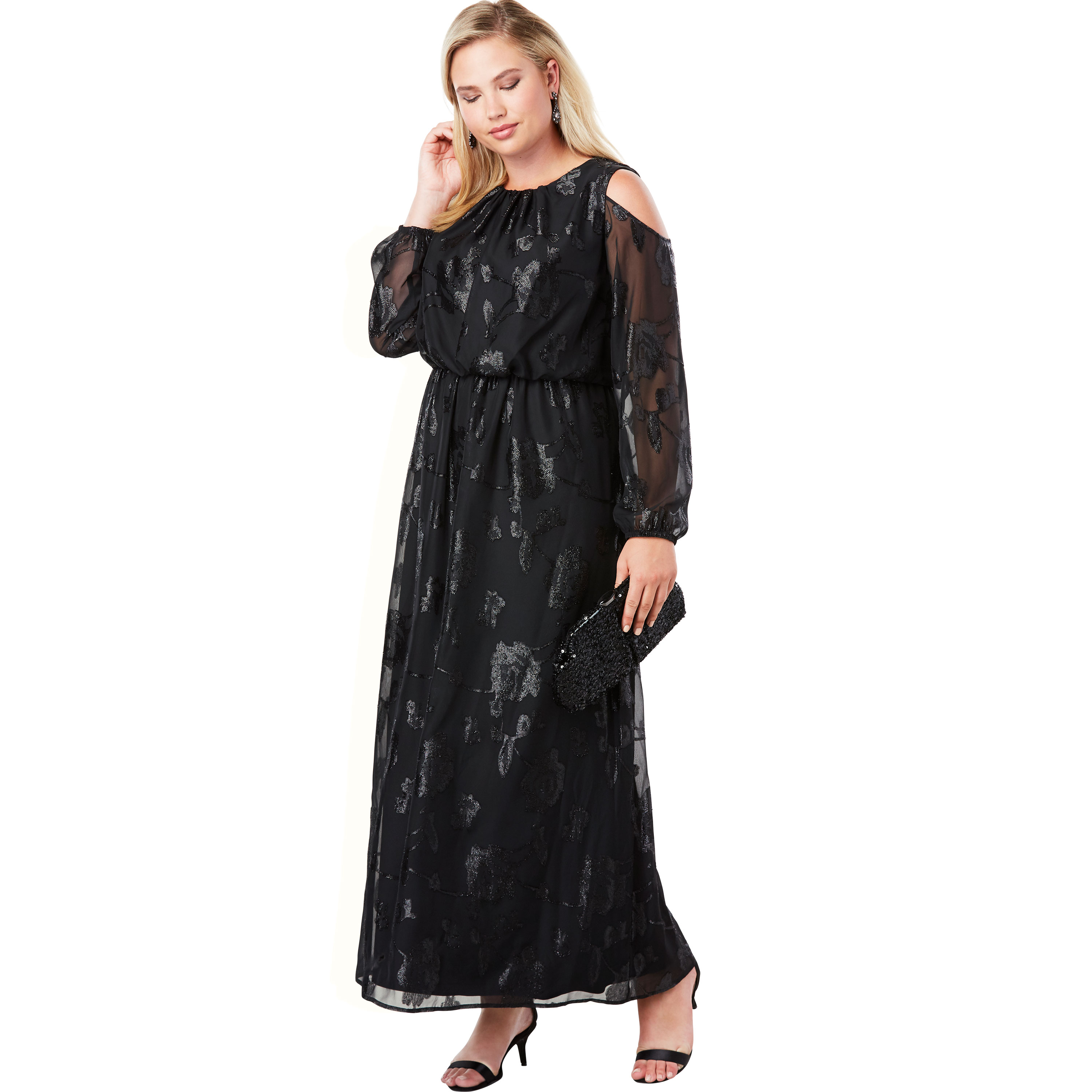 Jessica London Women's Burnout Maxi Dress. A fabulous shimmery burnout design with cold shoulders and a flowy blouson silhouette for an effortlessly festive look. Lined bodice. Shirring at neckline. Back zipper on lining. 59" length Poly Machine wash; imported Style & Fit Tips: Go long on festive fashion with this must-have maxi. The shimmery burnout silhouette gets instantly elevated with cold shoulder detail and the shirring at the neckline offers a feminine finish that you will love. Pair with pumps and style with a leather jacket for a party-perfect look this holiday season. Sale Price: 99.99 USD. SKU: 1832623031453mk12W12W. Brand: Jessica London. Color: Black. Gender: female.