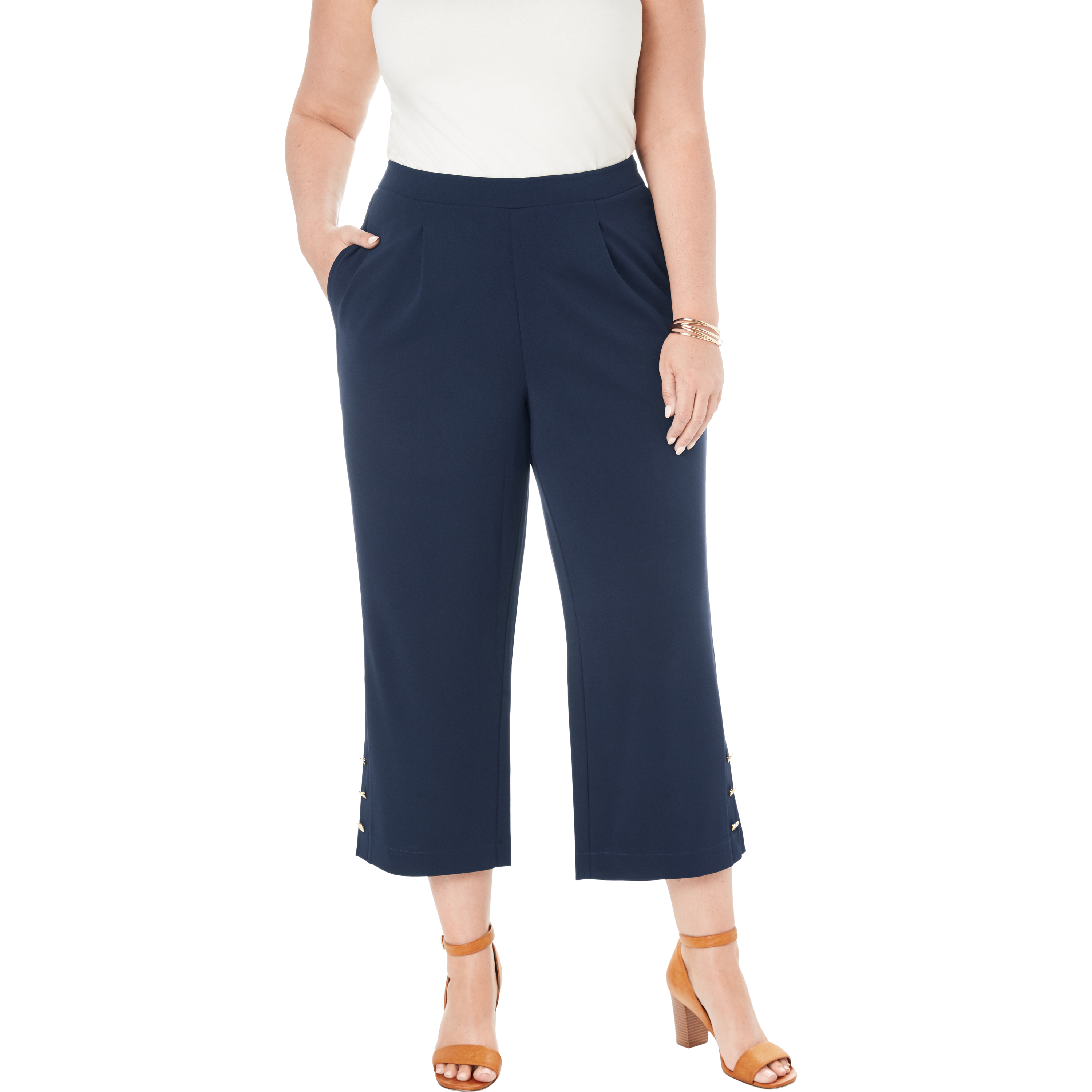 Jessica London Women's Knit Crepe Wide Crop Pants. Flat-front, elasticized waistband for comfort; front pleats for classic styling. Wide legs detailed with gold buttons. 23" inseamPoly/spandexMachine wash; imported Style & Fit Tips: With a wide-leg silhouette that flatters every figure, these cropped trousers are crafted with a hint of stretch and an elasticized waistband to keep you comfortable all-day long. Detailed with gold-tone buttons for a just-right dose of modern, feminine style, these pants are perfect for work, the weekend and everywhere in between. Sale Price: 59.99 USD. SKU: 2254823254958mk18W18W. Brand: Jessica London. Color: Navy. Gender: female.