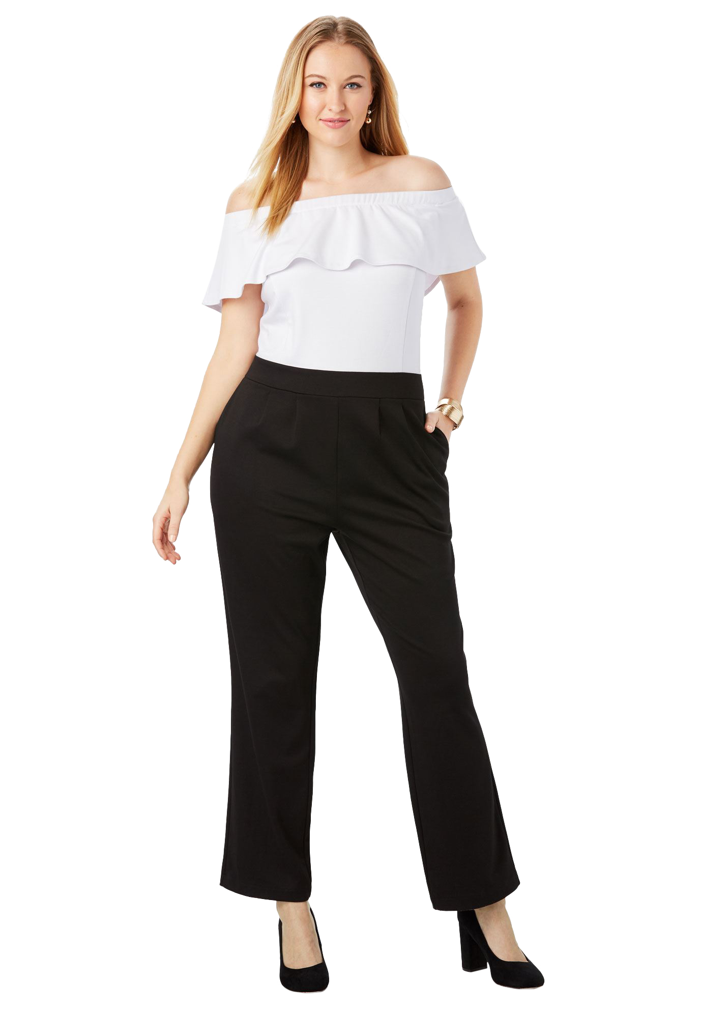 Jessica London Women's Ponte Colorblock Jumpsuit. An effortless one-step outfit with flattering flounce top and a slightly tapered leg. Off-the-shoulder styling for an instantly elevated look. Side seam pockets. Side zipper. 30" inseam Ponte -poly/rayon/spandex knitMachine wash; imported Style & Fit Tips: An effortlessly elegant approach to truly one-and-done dressing, this colorblock jumpsuit is a must-have. Stretch knit shapes an off-the-shoulder bodice with a flattering flounce top that flatters your figure. Pair with pumps to give your look a lift and complete with a beautiful bauble or earrings that dazzle. Sale Price: 99.99 USD. SKU: 0698323030315mk26W26W. Brand: Jessica London. Color: Black White Colorblock. Gender: female.