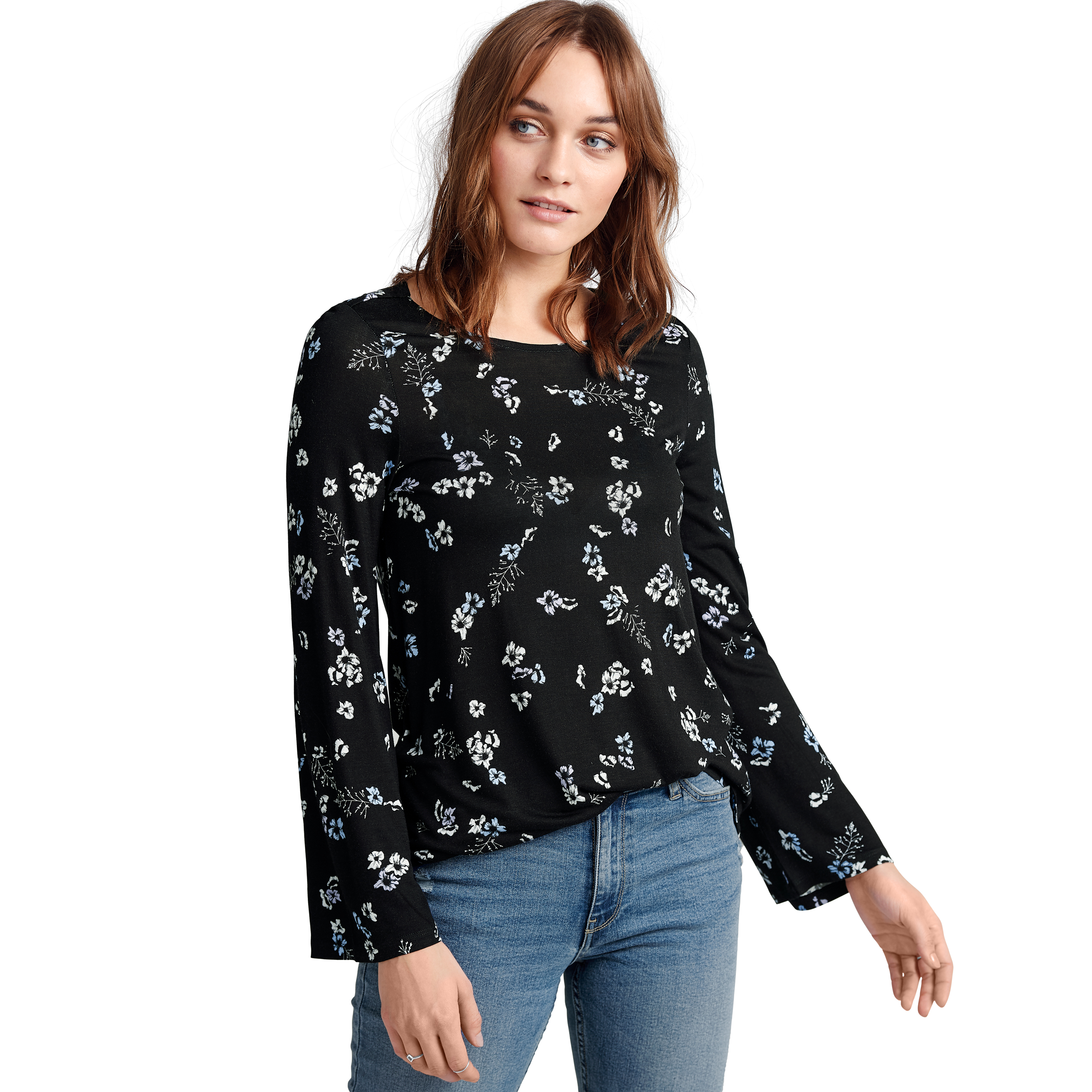 ellos Women's Bell Sleeve Tee Shirt. Sleeve interest! Spring has sprung in this simple yet elegant floral bell sleeve tee. Just add your favorite girlfriend jeans. Slight A-line silhouetteScoop necklineSlight high-low hemApprox. 30" hits below the hipRayon Jersey KnitMachine wash cold. Imported. Sale Price: 34.90 USD. SKU: 0855925070414mk18201820. Brand: ellos. Color: Black Floral. Gender: female.