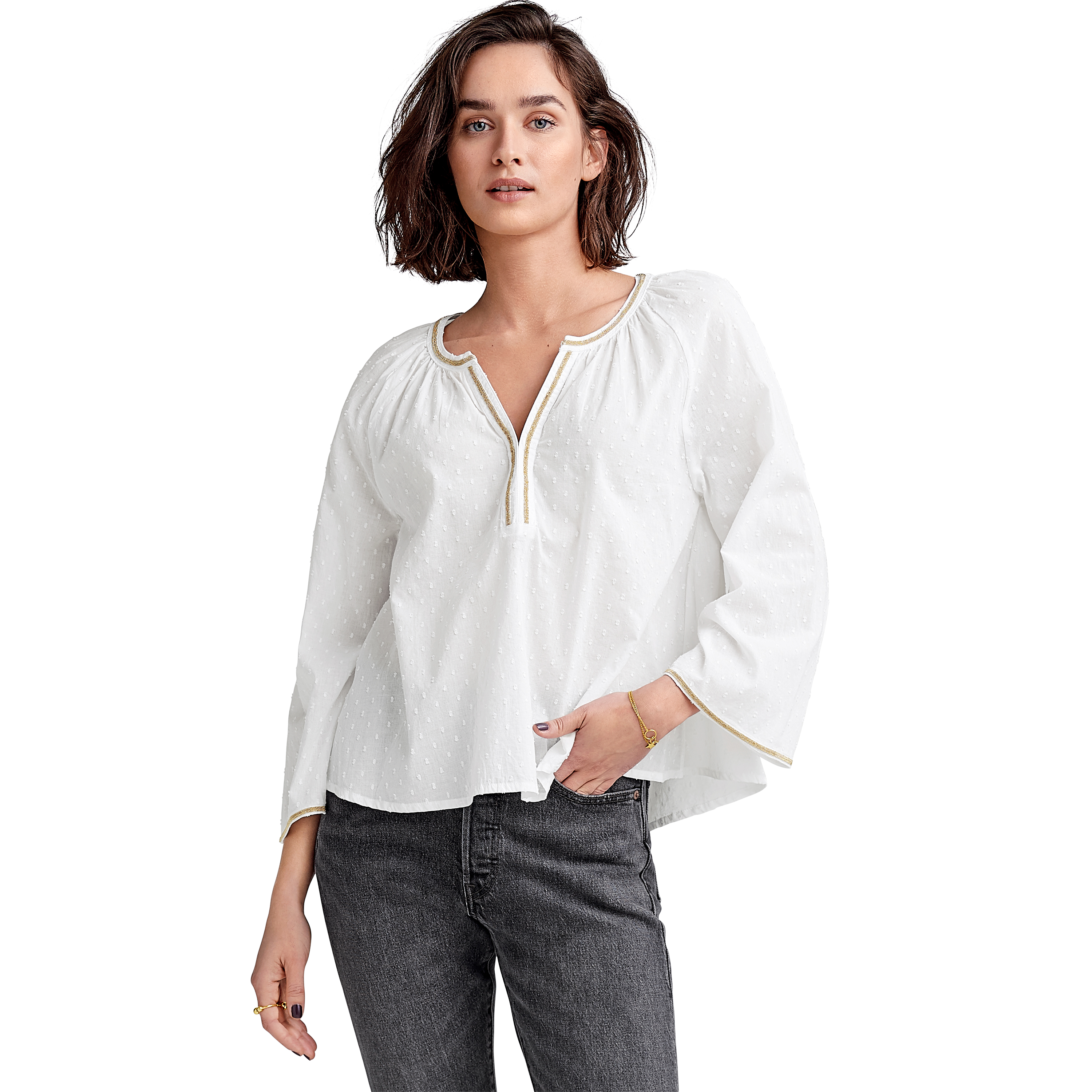 ellos Women's Metallic-Trim Swiss Dot Blouse Sweater. Accented with delicate metallic beads at the notch neckline and bell sleeve cuffs, this airy, textured Swiss-dot blouse is a warm-weather must have. A-line silhouetteNotch neckline with hidden hook & eye placket3/4 length raglan bell sleevesCurved bottom hemApprox. 28" hits at low hipSwiss Dot CottonMachine wash cold. Imported. Sale Price: 42.90 USD. SKU: 1009025300450mk1212. Brand: ellos. Color: White. Gender: female.